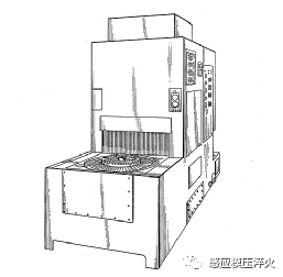 圖10.2.6 使用脈沖原理的四位自動齒輪壓力淬火機床剖視圖。