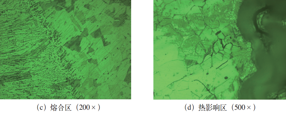 從滲液處(見圖1c)截取試樣,試樣包括母材、焊縫和熱影響區(qū),對試樣進(jìn)行預(yù)磨、粗磨、精磨和拋光,使用OLYMPUS-GX51金相顯微鏡對試樣進(jìn)行非金屬夾雜物觀察,之后用三氯化鐵鹽酸水溶液對其浸蝕,在金相顯微鏡下對試樣進(jìn)行組織觀察(見圖2)。