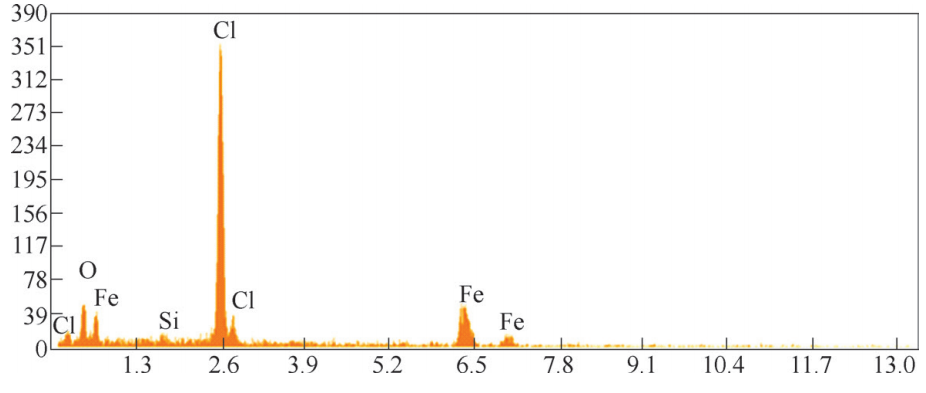 利用能譜儀分析不銹鋼管斷口表面的腐蝕產(chǎn)物,圖5為能譜分析結(jié)果。從衍射峰譜圖上可以直觀地看出,氯含量很高,說明該不銹鋼管處于含氯的腐蝕環(huán)境中。該化肥廠開裂失效鋼管置于露天環(huán)境,廠址地處沿海地帶,距海岸僅1.1km,屬于典型的海洋大氣環(huán)境。在溫度濕度較高時(shí),大量海水蒸發(fā)產(chǎn)生鹽霧現(xiàn)象,致使空氣中含有較高的氯離子,含有氯離子的水分吸附到不銹鋼管的外壁,形成腐蝕性介質(zhì),對不銹鋼管不斷腐蝕。奧氏體不銹鋼在普通大氣環(huán)境中,表面會形成致密的鈍化膜(氧化膜),此鈍化膜隔絕了大氣與不銹鋼表面直接接觸,對不銹鋼具有保護(hù)作用,使其具有優(yōu)良的耐腐蝕性能。即使鈍化膜被破壞,也會及時(shí)再生、修復(fù)。而氯離子極容易破壞奧氏體不銹鋼的鈍化膜,在表面形成點(diǎn)蝕或蝕坑,加速不銹鋼的腐蝕。
