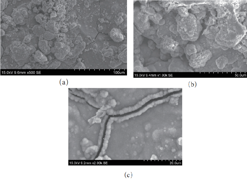 將加工好的斷口試樣置入掃描電鏡內(nèi),利用二次電子成像進(jìn)行微觀觀察、分析。如圖4所示,可以發(fā)現(xiàn)斷口高低不平,存在許多腐蝕產(chǎn)物和裂紋,裂紋呈樹枝狀分布,此類裂紋特征為二次裂紋,并且裂紋已經(jīng)深入到材料基體內(nèi)部。這些特征表明,該304不銹鋼管的破壞為應(yīng)力腐蝕開裂。不銹鋼的導(dǎo)熱性能差,鋼管在焊后由于高溫產(chǎn)生殘余應(yīng)力,不銹鋼管在受到腐蝕后產(chǎn)生的腐蝕微裂紋,在殘余應(yīng)力作用下,擴(kuò)展速率加快,形成應(yīng)力腐蝕開裂。
