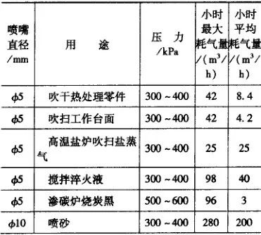 用于噴丸、吹干等用途的壓縮空氣消耗量可參考表 27 進行計算。各設備壓縮空氣年消耗量=小時平均消耗量×設備負荷率x設備設計年時基數。車間壓縮空氣年消耗量=各設備年消耗量之和×不正常損耗系數(一般取1.3~1.4) 。