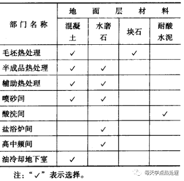 熱處理廠房的地面材料要求耐熱、耐蝕、耐沖擊,應根據車間生產工藝選擇,見表23。