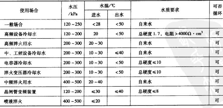 熱處理車間除高、中頻設備冷卻用水外,其余設備對水質無特殊要求,一般生活用水則可滿足要求。熱處理設備用水要求見表28。