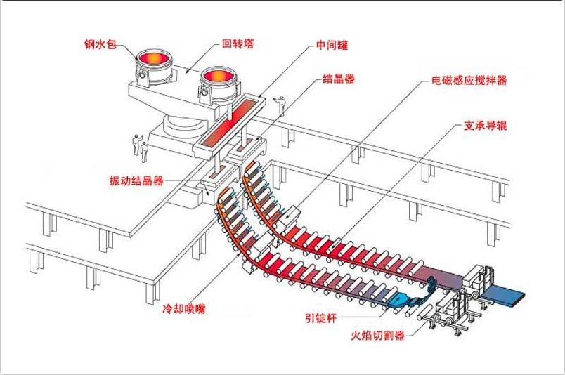 從結(jié)晶器出來的鋼坯的凝固殼很薄,約為10—30mm厚,內(nèi)部仍為鋼液。如果鋼坯表面有缺陷,鋼液有可能流出。因此,為了使從結(jié)晶器出來的鋼坯盡可能完全凝固,就必須繼續(xù)進(jìn)行冷卻,這種稱為二次冷卻。