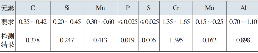 使用直讀式光譜儀對零件進行化學成分分析,該零件設計材質為38CrMoAl,實測結果見表1。