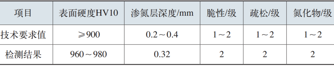 由表2可看出,正常部位滲氮后表面硬度、金相組織等均符合技術要求。