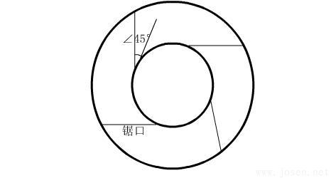 參照GB/T 13298,在完整的橫截面上冷切割截取鋼管,熱切割要去除熱影響區(qū)。鋼管盡量采用全截面磨制拋光,如鋼管直徑較大不能全截面磨制拋光,可在橫截面上截成幾段,鋸口寬度不大于2 mm(推薦使用線(xiàn)切割),鋸口與該點(diǎn)切線(xiàn)之夾角不大于45°夾角,以保證不漏檢焊縫,鋸口與鋼管的示意圖,見(jiàn)圖1。