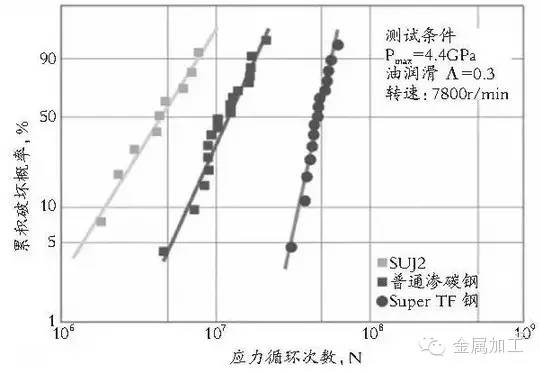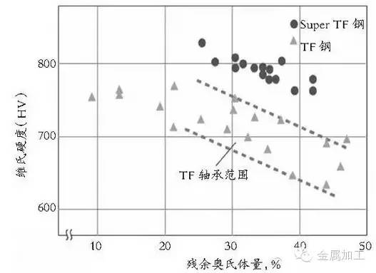 從常規馬氏體淬火后的組織中殘余奧氏體的含量一般為6%-15%,殘余奧氏體為軟的亞穩定相,在一定的條件下(如回火、自然時效或零件的使用過程中),其失穩發生分解為馬氏體或貝氏體,導致零件的硬度提高,韌性下降,尺寸發生變化而影響零件的尺寸精度甚至正常工作。對尺寸精度要求較高的軸承零件,一般希望殘余奧氏體越少越好,如淬火后進行補充水冷或深冷處理,采用較高溫度回火等。但殘余奧氏體可提高韌性和裂紋擴展抗力,一定的條件下,工件表層的殘余奧氏體還可降低接觸應力集中,提高軸承的接觸疲勞壽命,這種情況下在工藝和材料的成分上采取一定的措施來保留一定量的殘余奧氏體含量并提高其穩定性。目前國外成功開發了得到表面超高奧氏體含量熱處理技術,將軸承鋼的疲勞壽命最高提高了10倍,如圖1和圖2所示。