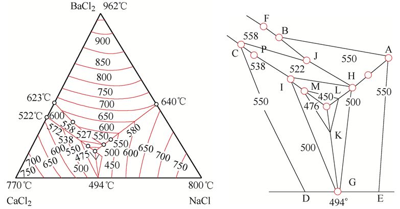 第二種:48%CaC12+31%BaC12+21%NaC1,熔點435℃,使用溫度460~550℃。相圖如圖2所示。為配料方便,工廠將之改為50%CaC12+30%BaC12+20%NaC1,熔點440℃,使用溫度也是460~550℃。適用有效直徑<40mm的高速鋼工件。兩種配方的中性鹽使用有別,一周連續開爐5天以上,建議用Ca基鹽,因為Ca基吸溫性極強,在空氣中很容易潮解;如果淬火件尺寸小且不每天開爐,用鋇基鹽比較合適。
