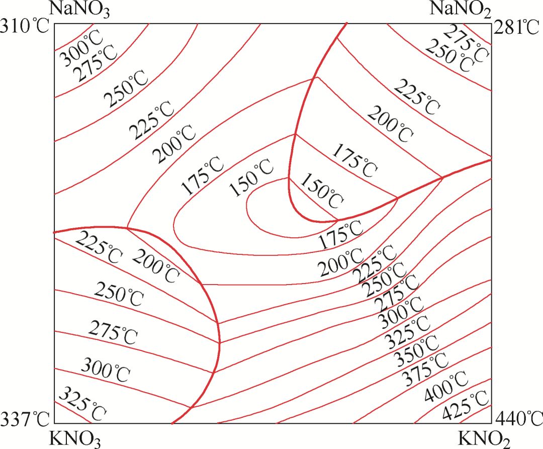 硝鹽系指NaNO3、KNO3、NaNO2、KNO2這四種鹽。作為淬火液,使用單一成分極少,常用兩種或三種混合鹽,配方及熔點如圖3所示。用得最多的配方是:55%KNO3+45NaNO2,熔點137℃,使用溫度160~550℃; 50%KNO3+50%NaNO2,熔點140℃,使用溫度160~550℃。用于低合金鋼制產品的淬火和高速鋼及高合金鋼工件的等溫淬火。有的企業用硝鹽浴作為大齒輪滲碳后的淬火液,解決了大齒輪熱處理難題。