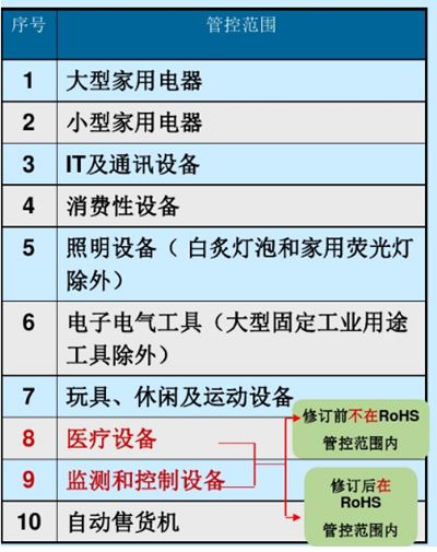 RoHS,是The Restriction of the use of Certain Hazardous Substances in Electricaland Electronic Equipment(《電氣、電子設備中限制使用某些有害物質指令》)的英文縮寫。RoHS指令規定:自2006年7月1日起禁止含有超過規定限量水平的鉛(Pb)、鎘(Cd)、汞(Hg)、六價鉻、多溴聯苯(PBB)和多溴二苯醚(PBDE)共六種有害物質的電子電氣產品進入歐盟。受控的電子電氣產品如下圖: