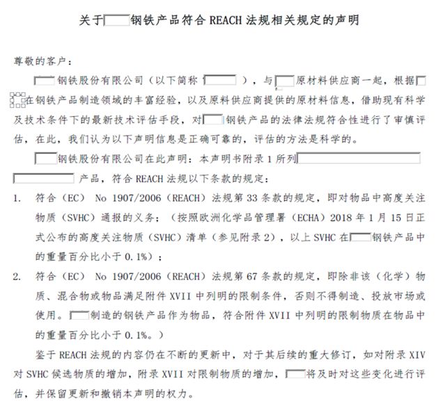 以下為國內某鋼廠關于歐盟REACH的聲明中文版范例。