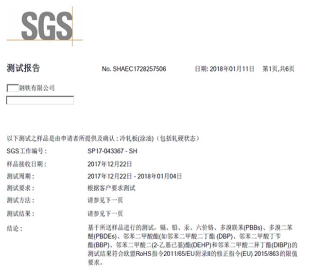 SGS是全球范圍內提供檢驗、鑒定、測試和認證服務的跨國公司,總部設在日內瓦,其服務范圍涉及工業、農業、化工等諸多行業。國內大部分鋼廠都是委托SGS做的REACH及RoHS測試報告,在貿易當中,對于環保合規性報告,有的人習慣叫SGS報告(其實是不精確的哦)。以下為某鋼廠委托SGS做的關于歐盟RoHS測試報告的中文版范例。