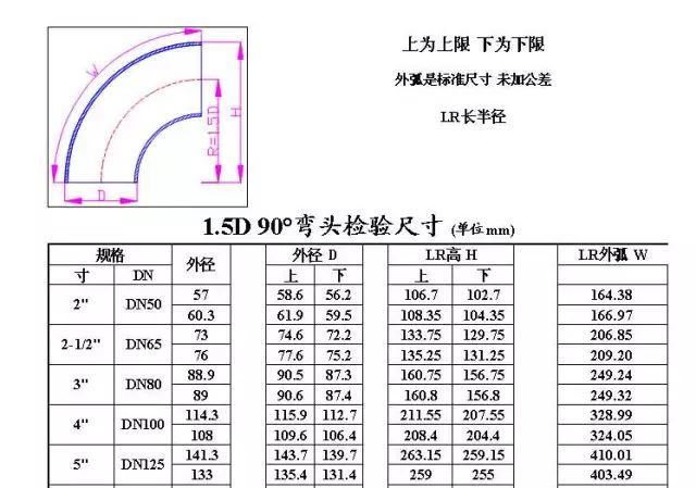 使用方法:比如檢測(cè)彎頭的外徑尺寸D 參照上限和下限的數(shù)據(jù) 實(shí)際測(cè)量的產(chǎn)品外徑在上下限之間即為合格 超出上限或下限范圍外即不合格產(chǎn)品