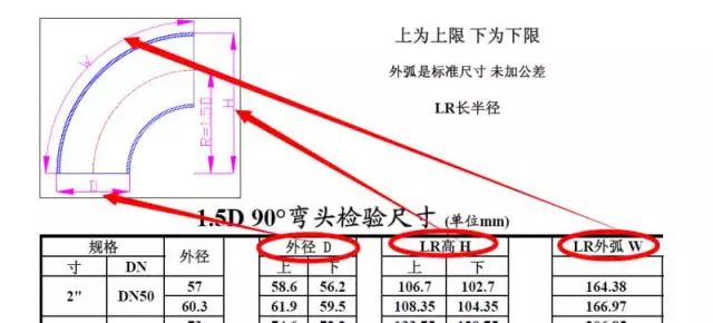 圖表檢測(cè)范圍:90°彎頭1.5D的外徑尺寸D 搓高只存H 和外弧尺寸W
