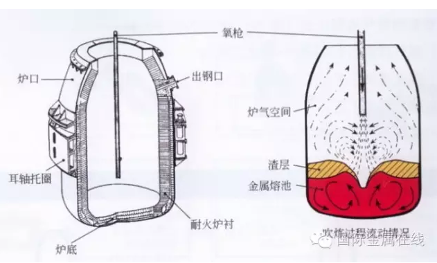 爐料通常為鐵水、廢鋼和造渣材料;也可加入少量冷生鐵和鐵礦石。通過氧槍從熔池上面向下吹入高壓的純氧(含O299.5%以上),氧化去除鐵水中的硅、錳、碳和磷等元素,并通過造渣進行脫磷和脫硫。各種元素氧化所產生的熱量,加熱了熔池的液態金屬,使鋼水達到現定的化學成分和溫度。它主要用于冶煉非合金鋼和低合金鋼;但通過精煉手段,也可用于冶煉不銹鋼等合金鋼。