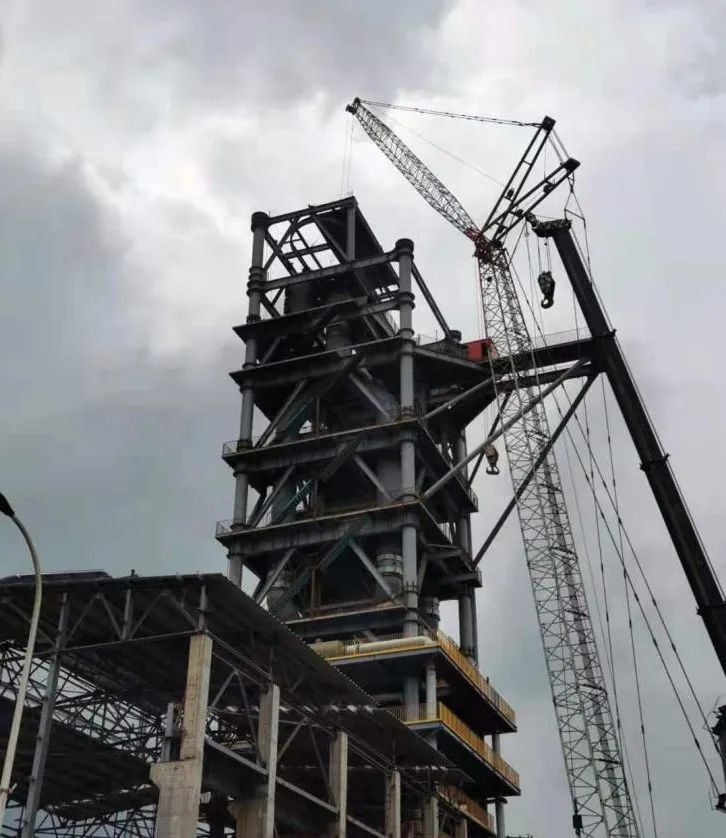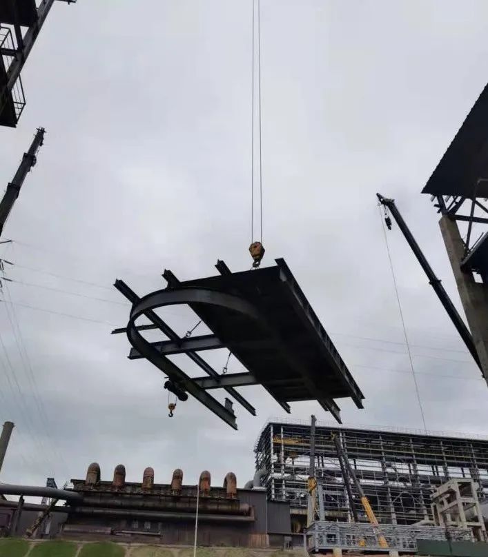 由于進入汛期,現場環境惡劣,導致施工難度加大,但是為了確保工程順利封頂,項目部全體職工在環境惡劣的情況下仍舊艱苦奮斗、努力拼搏,使高爐框架在7月17號順利封頂。