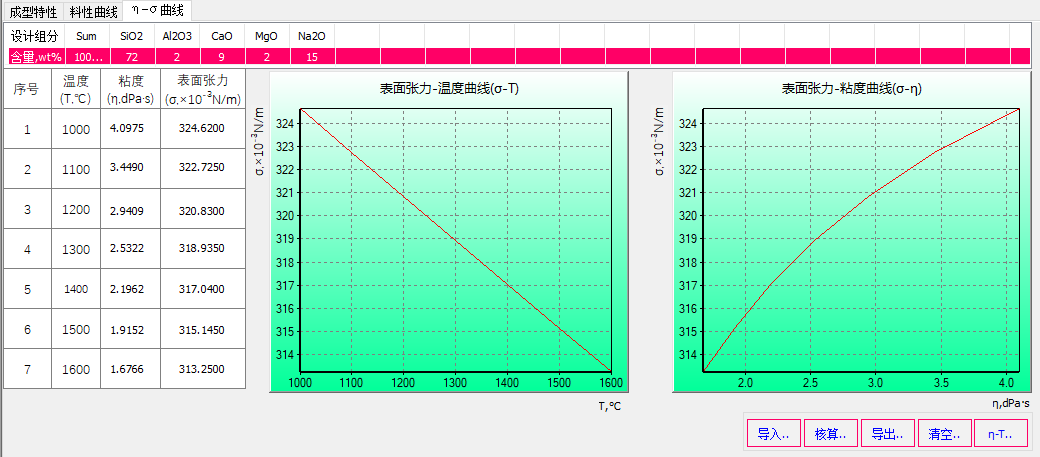 圖 3 根據(jù)玻璃設(shè)計(jì)組成核算粘度-溫度特征點(diǎn)及相鄰粘度值對(duì)應(yīng)的溫度差