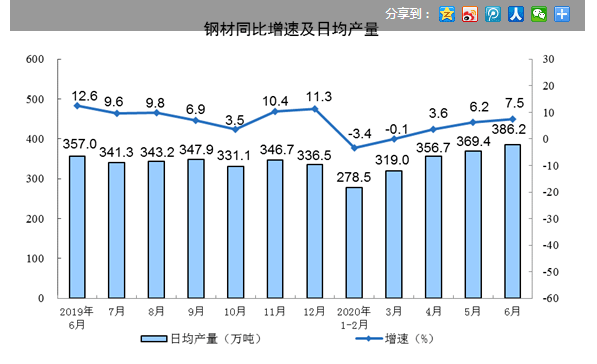 國家統計局數據顯示,2020年6月份我國粗鋼日均產量305.3萬噸,6月份生鐵日均產量255.5萬噸,6月鋼材日均產量386.2萬噸,環比5月份分別增長2.56%、2.42%和4.52%,再次全面刷新歷史新高。
