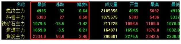 期螺下跌32收?qǐng)?bào)4935,期卷上漲27收?qǐng)?bào)5383,鐵礦石下跌15.5收?qǐng)?bào)1079.5,焦煤下跌3.5收?qǐng)?bào)1659,焦炭上漲56收?qǐng)?bào)2334。