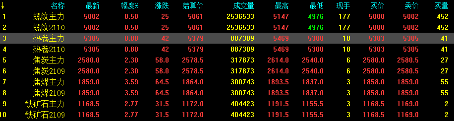 期螺上漲25收報5002,期卷上漲42收報5305,鐵礦石上漲31.5收報1168.5,焦煤上漲64.5收報1859,焦炭上漲58收報2580。