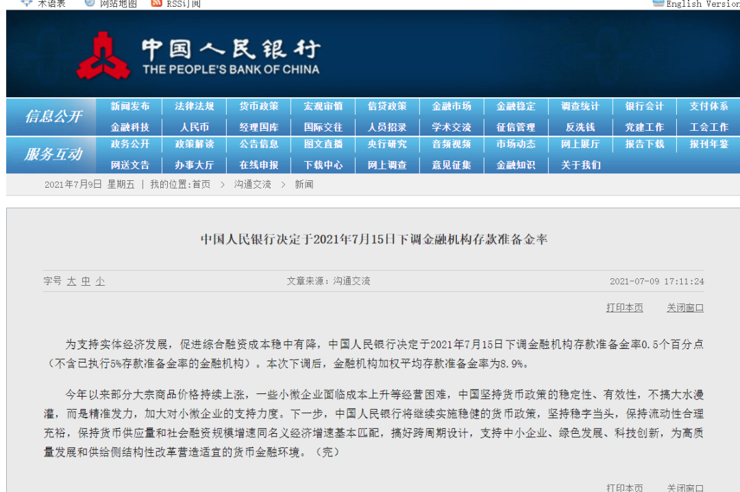 中國人民銀行周五表示,從7月15日起將所有銀行的存款準備金率(RRR)下調50個基點,這意味著將釋放約1萬億元人民幣的長期流動性,為經濟復蘇提供支撐。