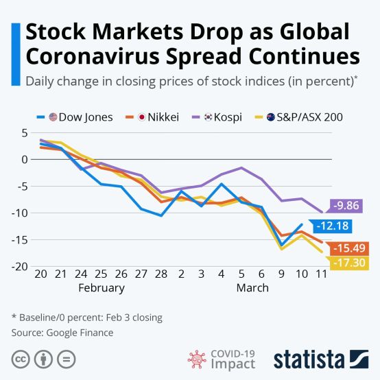 因?yàn)橥顿Y者對冠狀病毒COVID-19的潛在影響越來越擔(dān)憂,金融市場遭受重創(chuàng)。全球經(jīng)濟(jì)陷入恐慌,可能蒙受約2.7萬億美元的損失。許多公司正在關(guān)閉商店、辦公室和工廠,以遵守相關(guān)衛(wèi)生協(xié)議和當(dāng)?shù)胤ㄒ?guī)。