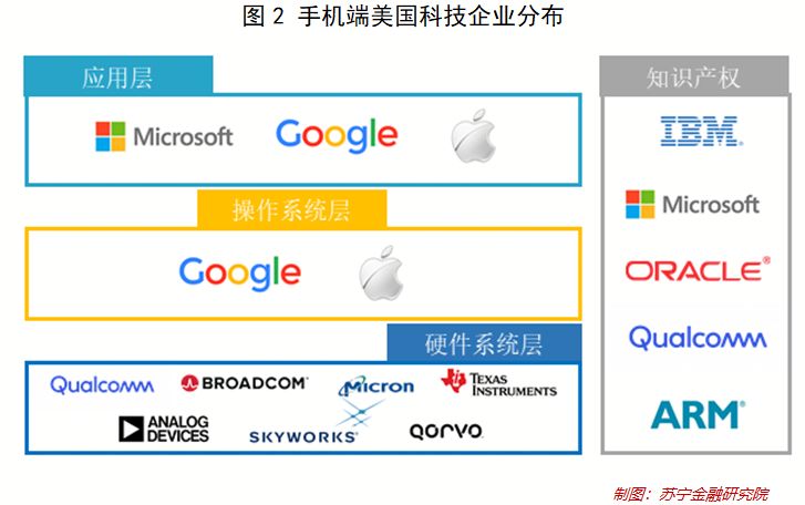 應用層是指面向用戶的應用服務,比如國內的微信、支付寶、蘇寧易購等,又比如國外的谷歌、微軟、Twitter、Facebook、Instagram等。由于在應用層的美國企業對于國內無論是市場占有率還是影響力都較為有限,而且又非不可替代,這里就不一一列舉了。