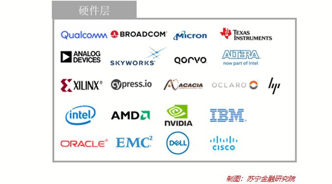 網絡和數據方面,具有影響力的美國企業有英特爾(Intel)、AMD、英偉達(Nvidia)、IBM、甲骨文(Oracle)、戴爾(Dell)、EMC(隸屬Dell)、思科(Cisco)、惠普(HP),涉及網絡交換機、路由器、中央處理器芯片(CPU)、顯示處理器(GPU)、IT服務器、數據庫存儲等領域。