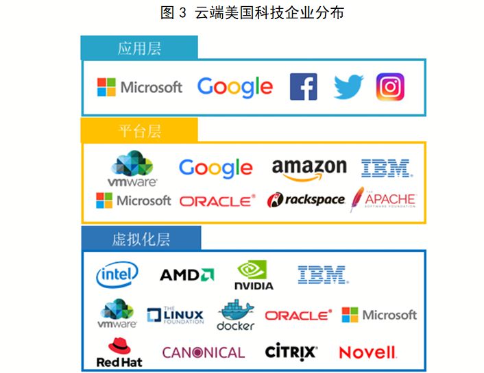 在虛擬化層,美國科技企業在全球具有壟斷性技術優勢,這些企業在技術版圖上呈現階梯型分布:首先,Intel、AMD、Nvidia和IBM作為芯片制造商,提供芯片架構與處理器指令集的虛擬化技術;其次,威睿(VMware)、微軟、Linux基金會(美國非盈利組織掌握Linux內核開發)提供操作系統內核虛擬化技術;在被業內稱為輕量級虛擬化技術的容器技術領域,也有Docker這樣的美國企業占據市場主導地位;最后,還有甲骨文、紅帽(Red Hat,隸屬IBM旗下)、Canonical、思杰(Citrix)、網威(Novell)提供企業級虛擬化產品。
