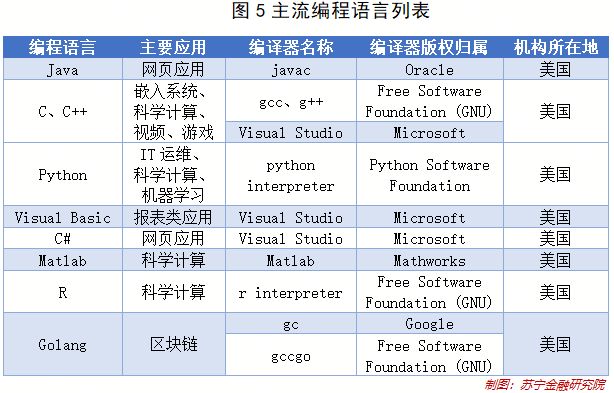 在這些編程語言當中,有很多已成為國際標準。需要指出的是,雖然語言本身已成為國際標準,但其具體實現(專業術語叫編譯器)還是有版權的。以下表格匯總了上述編程語言的主要應用場景、主流編譯器、以及版權歸屬情況。從中可以看到,這些語言的主流編譯器的版權均為美國公司或美國非盈利機構所有。