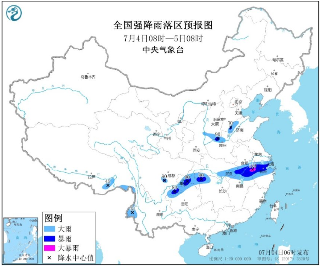 7月3日,中國氣象局應急減災與公共服務司新聞發言人王志華在發布會上表示,7月4日至13日,主雨帶仍位于西南地區東部、江南北部、江漢、江淮至黃淮等地,大部地區降雨量較常年同期偏多5至8成,部分地區偏多1倍以上,受前期降雨累積效應影響,這些地區暴雨致災風險大。其中,7月4日-7日,西南地區東部至長江中下游一帶的降雨將再度增強。重慶、貴州以及江漢、江淮、江南北部等地的部分地區有大到暴雨,局地大暴雨。