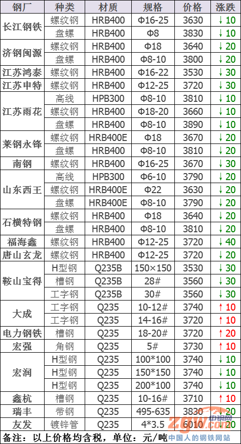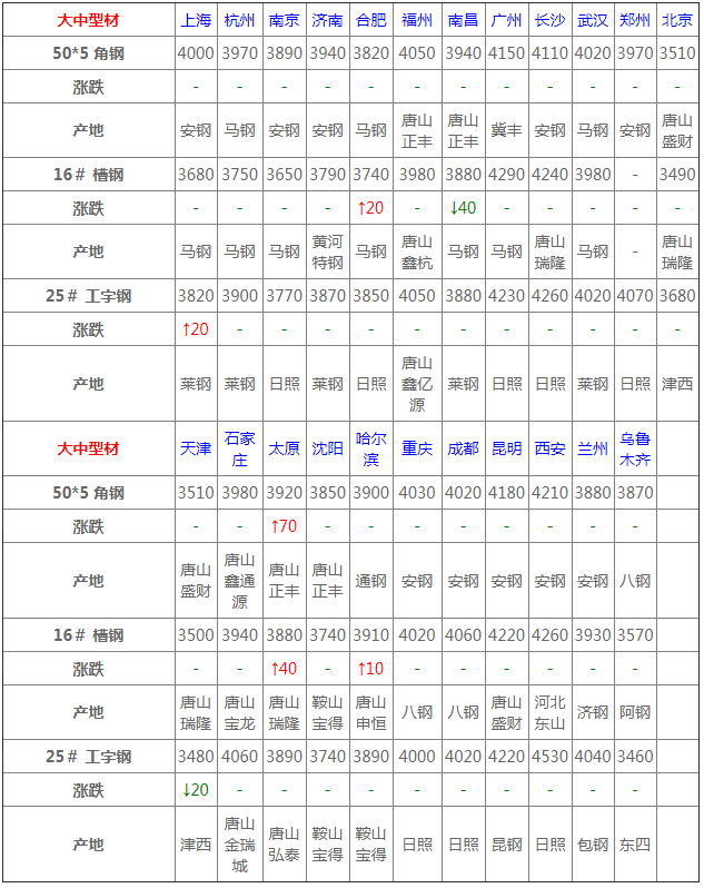 據數據監測,今日共26家鋼廠調價,其中漲幅最高為電力槽鋼,調價幅度20元/噸,跌幅最大為鞍山寶得型材,調價幅度30元/噸,具體調價明細如下: