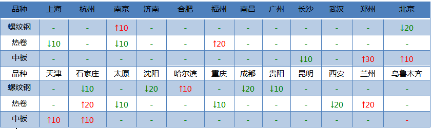 螺紋鋼24個市場中2個市場上漲10,5個市場下跌10-20, 20mmHRB400E平均價格3818元/噸,較上個交易日下調3元/噸;