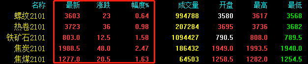 今日期貨全面翻紅,期螺漲23收?qǐng)?bào)3603,期卷漲36收?qǐng)?bào)3723,鐵礦石漲12.5收?qǐng)?bào)803,焦炭漲48收?qǐng)?bào)1988.5,焦煤漲20.5收?qǐng)?bào)1277。