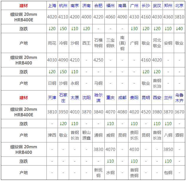 12月1日建材價格:跌10-40;