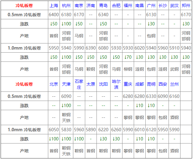 今全國冷軋市場價格穩中偏弱,幅度20-100元,商家隨行調整,積極出貨為主,但整體成交情況較弱,下游終端詢價多,拿貨較少,觀望情緒濃厚;