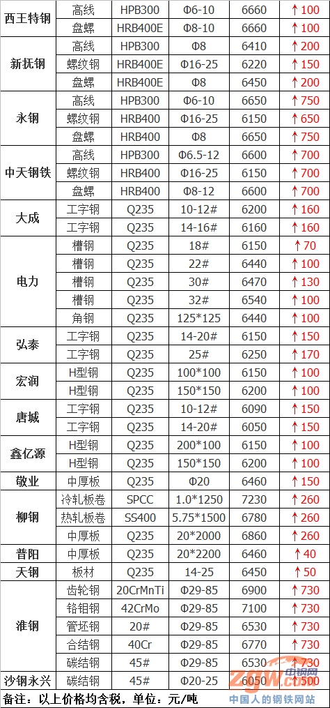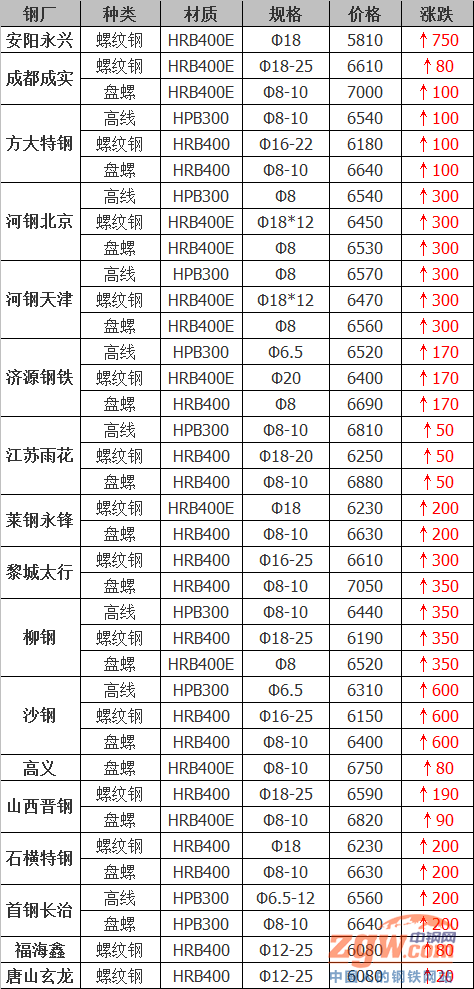 據(jù)數(shù)據(jù)監(jiān)測(cè),今日共39家鋼廠調(diào)價(jià),其中漲幅最高為永鋼線材,調(diào)價(jià)幅度750元/噸,具體調(diào)價(jià)明細(xì)如下: 鋼廠調(diào)價(jià) 山西建邦建材價(jià)格平穩(wěn) 武安裕華高線價(jià)格平穩(wěn) 柳鋼建材上調(diào)350元/噸 江蘇雨花建材上調(diào)50元/噸 福海鑫螺紋鋼上調(diào)80元/噸 方大特鋼建材上調(diào)100元/噸 濟(jì)源鋼鐵建材上調(diào)170元/噸 首鋼長(zhǎng)治建材上調(diào)200元/噸 河鋼北京建材上調(diào)300元/噸 河鋼天津建材上調(diào)300元/噸 石橫特鋼建材上調(diào)200元/噸 萊鋼永鋒建材上調(diào)200元/噸 西王特鋼建材上調(diào)100元/噸 唐山玄龍螺紋鋼上調(diào)20元/噸 新?lián)徜摻ú纳险{(diào)150-200元/噸 成都成實(shí)建材上調(diào)80-100元/噸 山西高義建材價(jià)格上調(diào)80元/噸 沙鋼5月中旬建材上調(diào)600元/噸 安陽(yáng)永興建材價(jià)格上調(diào)750元/噸 山西晉鋼建材上調(diào)90-190元/噸 永鋼5月中旬建材上調(diào)750元/噸 黎城太行建材上調(diào)300-350元/噸 中天鋼鐵5月中旬建材上調(diào)700元/噸 山東傳洋型材價(jià)格平穩(wěn) 大成工字鋼上調(diào)160元/噸 唐城工字鋼上調(diào)150元/噸 宏潤(rùn)H型鋼上調(diào)100元/噸 電力型材上調(diào)70-130元/噸 鑫億源H型鋼上調(diào)100元/噸 弘泰工字鋼上調(diào)150-170元/噸 瑞豐帶鋼價(jià)格平穩(wěn) 天鋼板材上調(diào)50元/噸 柳鋼板材上調(diào)260元/噸 普陽(yáng)中厚板上調(diào)40元/噸 敬業(yè)中厚板上調(diào)150元/噸 山鋼特鋼價(jià)格平穩(wěn) 淮鋼優(yōu)鋼上調(diào)730元/噸 沙鋼工業(yè)線材上調(diào)550元/噸 沙鋼永興碳結(jié)鋼上調(diào)500元/噸 濟(jì)源鋼鐵部分優(yōu)鋼上調(diào)200元/噸 鋼廠調(diào)價(jià)占比 上調(diào)34家,占比87.2%,調(diào)價(jià)幅度40-750元/噸。 平穩(wěn)5家,占比12.8%。
