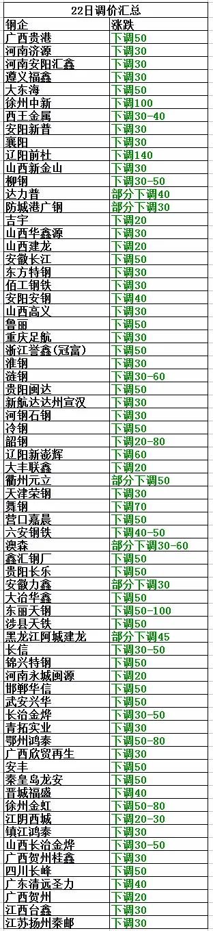 6月22日防城港廣鋼部分下調30:配重一類3990,配重2類3890,沖片一類3990,沖片二類4050,沖片三類4030,沖片四類4030,壓塊一類3990,壓塊二類3700,剪切一類3830,剪切二類3810,剪切三類3790,剪切四類3620,加工大料1類3300,加工大料2類3200。特優精料2100,特級1260,含稅。
