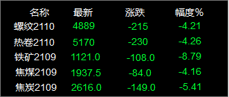 6月進入下旬,鋼價延續跌勢,今日期鋼跌幅持續擴大,受國家發改委與市場監管總局聯合調研鐵礦石現貨市場交易相關消息影響,鐵礦石領跌黑色系,現貨報價進一步下探。期鋼大跳水超200,跌幅超預期。期螺下跌215收報4889,期卷下跌230收報5170,鐵礦石下跌108收報1121,焦煤下跌84收報1937.5,焦炭下跌149.5收報2616。唐山鋼坯昨日下調50元,現報4850元/噸,網優廢鋼統計21日3漲72跌,今早0漲77跌。