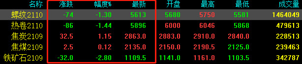 今日期貨午后走弱,持續(xù)下跌。期螺下跌74收?qǐng)?bào)5613,期卷下跌86收?qǐng)?bào)5896,焦炭上漲32.5收?qǐng)?bào)2863,焦煤上漲2.5收?qǐng)?bào)2135,鐵礦石下跌32收?qǐng)?bào)1109.5。