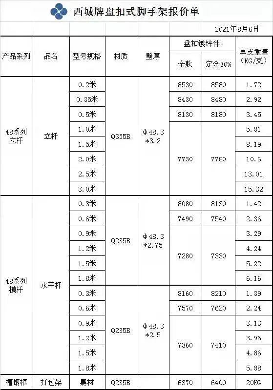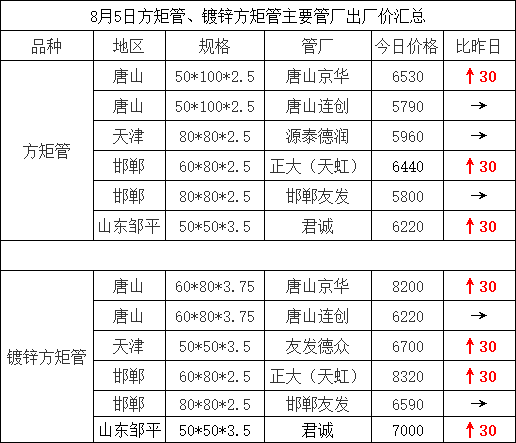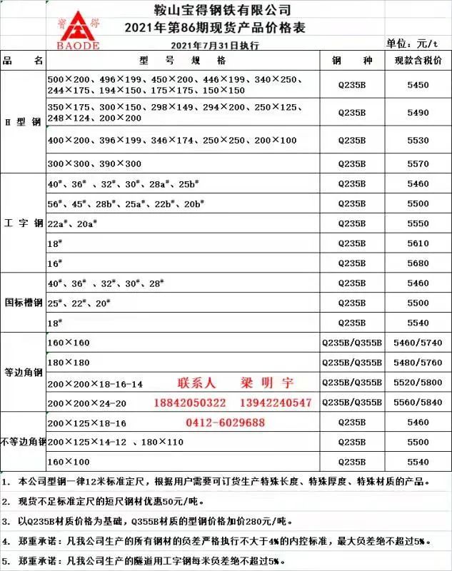 8月6日邯鄲日鑫鍍鋅板出廠價格信息 其中,1.0*1250*C規格,鋼廠指導價為6500元/噸, 以上價格為現匯含稅出廠價格,特殊規格特殊鋅層和特殊鋼種,另行議價。 上述價格自2021年8月6日起執行。 (以上價格的最終解釋權,歸邯鄲市日鑫板材有限責任公司銷售部。) 中厚板 下調50元/噸 以上調整均為現款含稅價格, 執行日期從2021年8月6日起。 中厚 出廠價格 以上調整均為過磅含稅價格, 執行日期從2021年8月6日起。 中厚板 下調50元/噸 以上調整均為含稅價格, 執行日期從2021年8月6日起。 中厚板 出廠價格 以上調整為現金含稅價格, 執行日期從2021年8月6日起。 中厚板 出廠價格 以上調整為含稅價格, 執行日期從2021年8月6日起。 角鋼 下調20元/噸 槽鋼 下調20元/噸 以上均為過磅含稅價格, 執行日期從2021年8月6日起。 槽鋼 出廠價格 以上調整均為過磅含稅價格, 執行日期從2021年8月6日起。 角鋼 出廠價格 以上調整均為過磅含稅價格, 執行日期從2021年8月6日起。 槽鋼 出廠價格 以上調整均為過磅含稅價格, 執行日期從2021年8月6日起。 H型鋼 出廠價格 以上調整均為過磅含稅價格, 執行日期從2021年8月6日起。 工字鋼 下調10元/噸 以上調整均為過磅含稅價格, 執行日期從2021年8月6日起。 工字鋼 下調10元/噸 以上調整均為過磅含稅價格, 執行日期從2021年8月6日起。8月6日文豐中厚板價格調整信息 14-25mm/Q235 5670元/噸 8月6普陽中厚板價格調整信息 14-25mm/Q235 5700元/噸 8月6日敬業中厚板價格調整信息 14-25mm/Q235 5700元/噸 8月6日天鋼中厚板價格調整信息 14-25mm/Q235 5700元/噸 8月6日冀鋼中厚板價格調整信息 14-25mm/Q235 5700元/噸 8月6日山東傳洋型鋼價格調整信息 5#/Q235B 5590元/噸 6.3#/Q235B 5630元/噸 8月6電力鋼鐵槽鋼價格調整信息 18#/Q235 -- 20#/Q235 -- 22#/Q235 5870元/噸 25#/Q235 5870元/噸 28#/Q235 5870元/噸 30#/Q235 5900元/噸 32#/Q235 5970元/噸 月6日電力鋼鐵角鋼價格調整信息 125*125/Q235 5870元/噸 140*140/Q235 5870元/噸 160*160/Q235 5870元/噸 180*180/Q235 5870元/噸 200*200/Q235 5870元/噸 8月6日歐聯槽鋼價格調整信息 22#Q235 5870元/噸 25#Q235 5870元/噸 28#Q235 5870元/噸 30#Q235 5900元/噸 32#Q235 5970元/噸 36#Q235 -- 40#Q235 -- 8月6日宏潤鋼廠H型鋼價格調整信息 100*100/Q235 5600元/噸 125*125/Q235 5600元/噸 150*75/Q235 5600元/噸 150*150/Q235 5650元/噸 198*990/Q235 5600元/噸 200*100/Q235 5600元/噸 250*125/Q235 5650元/噸 148*100/Q235 5700元/噸 248*124/Q235 5650元/噸 8月6日大成工字鋼價格調整信息 10-12#/Q235 5580元/噸 14-16#/Q235 5540元/噸 8月6日唐山唐城工字鋼價格調整信息 10-12#/Q235 5540元/噸 14-20#/Q235 5490元/噸