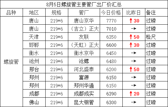 8月5日長江鋼鐵建材價格調整信息 螺紋鋼 上調80元/噸 Φ16-25mmHRB400 盤螺 上調130元/噸 Φ8mmHRB400 5650元/噸 以上調整均為含稅價格, 執行日期從2021年8月5日起。 8月6日福建三鋼建材價格調整信息 螺紋鋼 下調200元/噸 Φ16-25mmHRB400E 5400元/噸 高線 下調200元/噸 Φ8-10mmHPB300 5750元/噸 盤螺 下調200元/噸 Φ8-10mmHRB400E 5850元/噸 以上調整均為含稅價格, 執行日期從2021年8月6日起。 8月6日石橫特鋼建材價格調整信息 螺紋鋼 Φ18-22mm HRB400E 5370元/噸 盤螺 Φ8-10mm HRB400E 5800元/噸 以上調整均為含稅價格, 執行日期從2021年8月6日起。5300元/噸 出廠價格 出廠價格