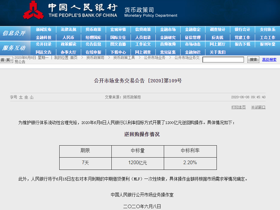 本周一有5000億元MLF到期,周四有700億元逆回購(gòu)到期,周五有1500億元逆回購(gòu)到期。共計(jì)7200億元巨量資金到期,為緩解市場(chǎng)流動(dòng)性壓力,央行今日開展1200億元逆回購(gòu)操作,此外,人民銀行將于6月15日左右對(duì)本月到期的中期借貸便利(MLF)一次性續(xù)做,關(guān)注利率變動(dòng)。